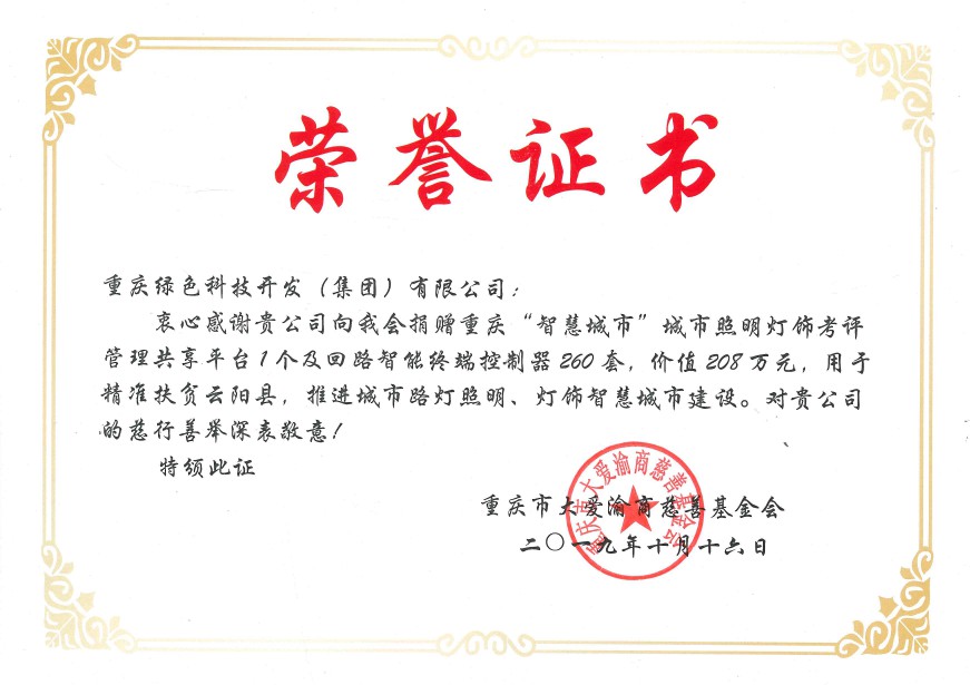 10月16日,重慶綠色科技開發(fā)(集團)有限公司為支持國家級重點貧困縣精準扶貧工作,積極推進智慧城市建設(shè),通過重慶市大愛渝商慈善基金會,向云陽縣市政設(shè)施管理所捐建了回路智能終端控制器260套,以及配套建設(shè)重慶“智慧城市”城市照明燈飾四級考評管理共享平臺1個,總價208萬元,用于解決云陽縣城市路燈照明智能化管理的問題,幫助云陽縣實現(xiàn)市政府在《重慶市城市綜合管理提升行動方案》提出的城市照明“一把閘刀”管理的要求。